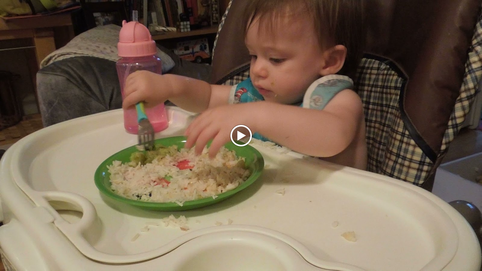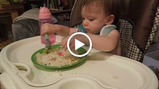 Here she is feeding herself with both fork and hand. Much faster that way. Rice and noodles are her favorite to try with the fork. I could literally bathe her after every meal. She is quite the exhuberant eater.